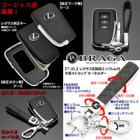 [10系RC/200系LX]ブラガ/レクサス車用互換品キーケース【タイプ2L/BK】ブラック牛革&メッキ/スマートキー対応/Lマークエンブレム付/牛革キーホルダー付/客注品